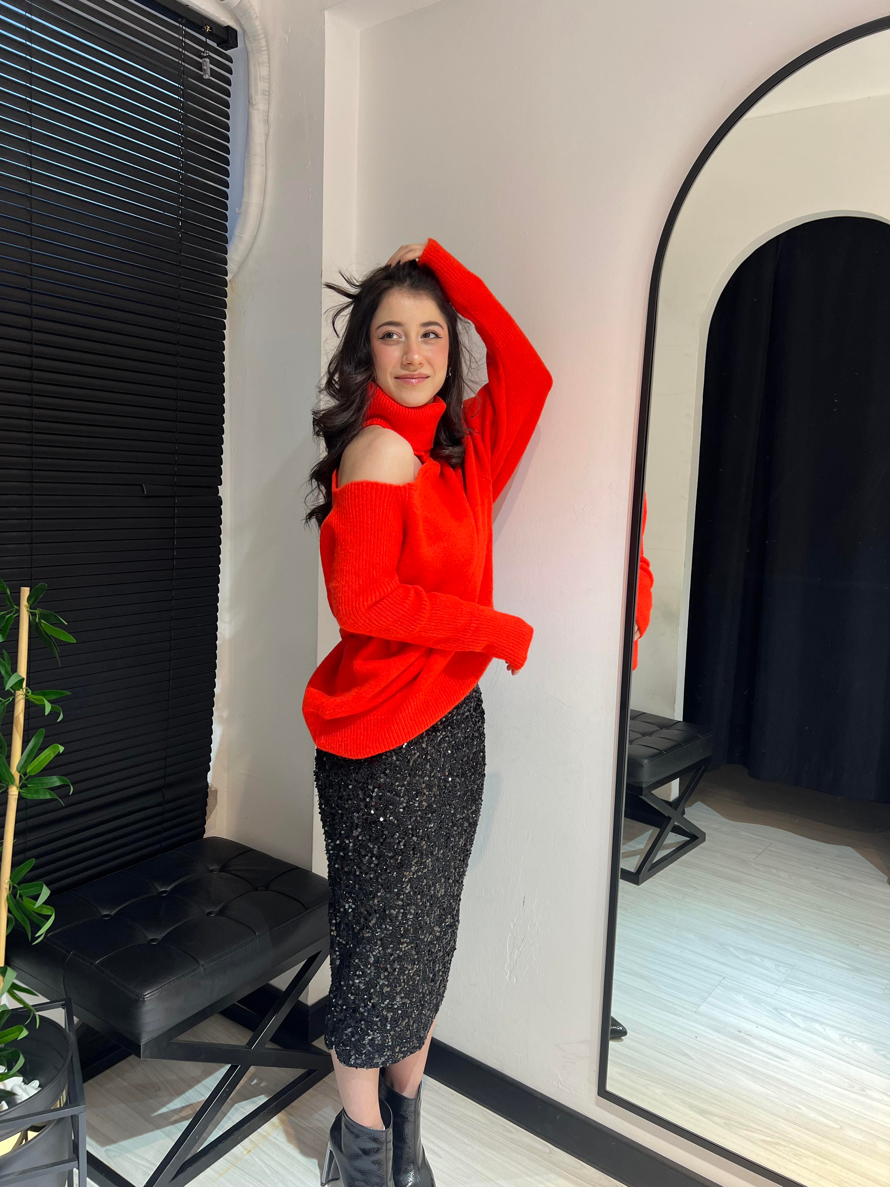 S.Boğazlı Omuz Detaylı Kazak-Kırmızı